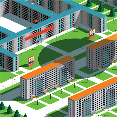 John’s geometric collages ooze Bauhaus perfection. Constructed from layers of carefully crafted vintage papers they represent an architectural ideal long since abandoned by Berlin’s inhabitants. The faceless tower blocks, empty plazas and wide streets are powerfully evocative of the former Eastern Bloc and the utilitarian ideals that governed the post-war era, compounded by the billboards of an unknown dictator foxing his gaze on the deserted streets.